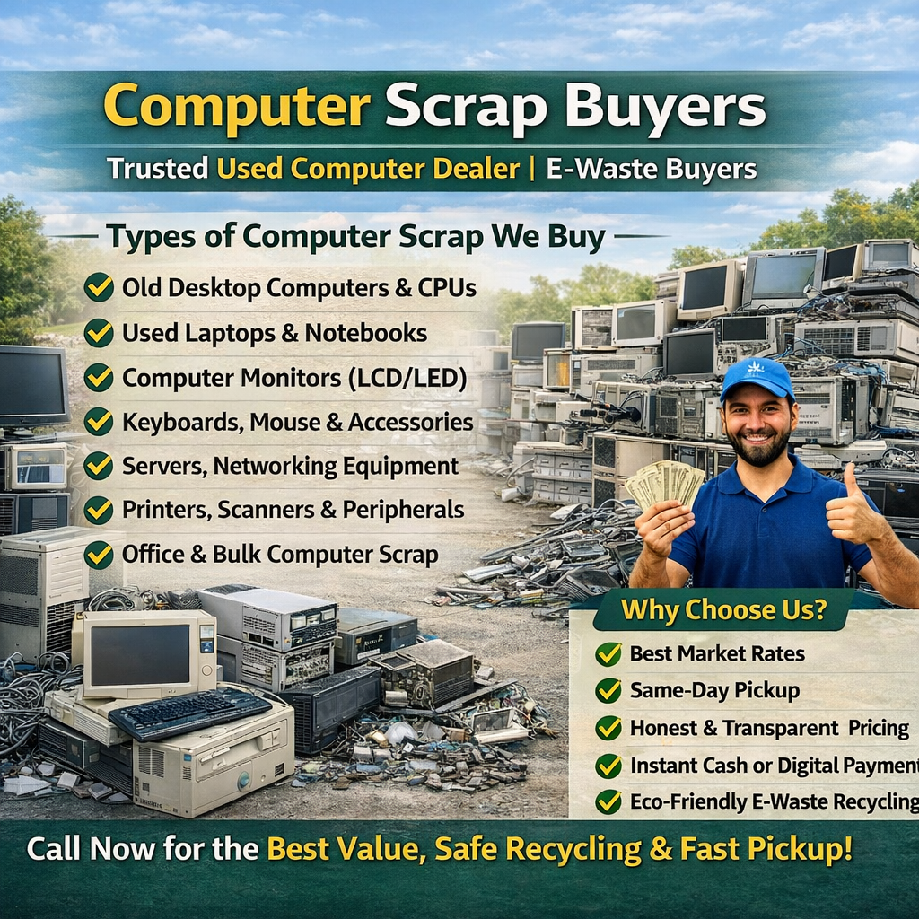 We are professional Computer Scrap Buyers offering safe, reliable, and eco-friendly solutions for disposing of old and unused computer equipment. As a trusted Used computer dealer, we buy all types of computer scrap from homes, offices, schools, IT companies, and commercial spaces, ensuring fair pricing and hassle-free service.